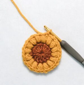 Attach new yarn with a slip stitch into any double crochet (dc). Chain two, work a puff stitch in the same stitch, then continue with a puff stitch in each dc around. Join by slip stitching to the top of the first puff stitch. You should have 16 puff stitches. Cut the yarn and fasten it off.
