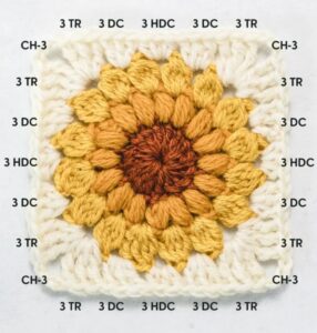 For the first side of the square, work three double crochets (dc) in the next chain-2 space, followed by three half double crochets (hdc) in the following chain-2 space, and finish the side with three more dc in the next chain-2 space. This completes the first side.